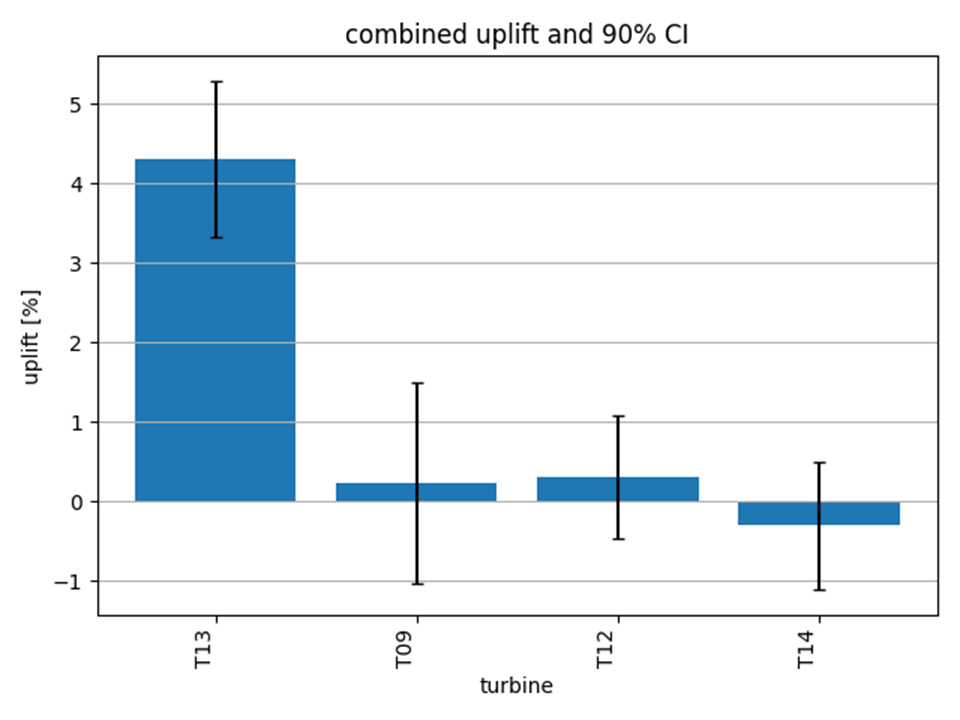 The script uplift_analysis/aero_up.py analyses the energy uplift thanks to AeroUp for T13. The result is a P50 uplift of 4.3% with a 90% confidence interval of 3.3% to 5.3%. This is visualised in the plot below along with the uplift results for the three selected reference turbines, which are near 0% uplift as expected.