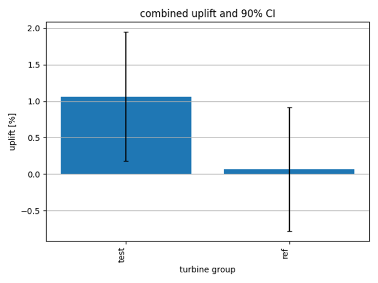 The script uplift_analysis/tune_up.py analyses the energy uplift thanks to TuneUp for nine test turbines. The result is a P50 uplift of 1.1% with a 90% confidence interval of 0.2% to 2.0%. This is visualised in the plot below along with the uplift result for the ten unchanged reference turbines, which is near 0% uplift as expected.