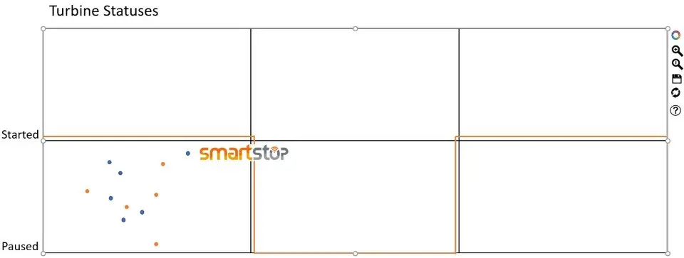 Figure 3: SMARTStop in action. The dots represent unwanted turbine sound detected by SMARTStop which leads to pausing the turbine. When unwanted sound disappears thanks to SMARTStop, the system restarts the turbine in safe conditions.